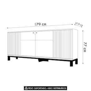 Composto por quatro portas convencionais com dobradiças metálicas, conta com duas portas laterais que apresentam uma textura microripada exclusiva e fecho toque. Nas portas centrais o puxador ponto em ABS adiciona um toque minimalista e elegante, completando o design do Buffet Aparador com perfeição.