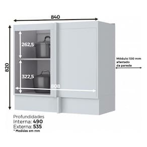 ESPECIFICAÇÕES: Estrutura 100% MDF Pintura UV 1 Porta Dobradiças de 35mm com amortecimento Puxadores em zamac ouro velho Usinagem em baixo relevo Altura do balcão sem o pé: 67,5 Opção de instalação sem pés, suspensa Montagem pode ser realizada do lado esquerdo ou direito *O módulo canto reto fica 10cm afastado da parede e deve-se contar largura total de 94cm para projetos *Não acompanha Tampo Balcão