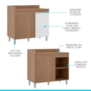 Balcão Canto Reto Sabrina 1 Porta 94x88cm Mdp Menu Móveis Branco O Balcao de Canto para Cozinha Sabrina foi desenvolvido para atender todas as suas necessidades diarias com um design moderno, cheio de personalidade, beleza e versatilidade. Por se tratar de armario de cozinha modulado voce pode ajustar os modulos conforme o espaco disponivel e montar diversas modulacoes diferentes para deixar o ambiente muito mais aconchegante. A elegancia fica por conta dos puxadores em perfil e os pes na cor prata dando um toque unico de sofisticacao. Produzido com materiais de excelente qualidade, garantindo a durabilidade e vida util. O melhor em moveis no design atual aliando conforto, qualidade e otimos precos, so na Menu Moveis! Caracteristicas: Produzido em MDP de 15 mm Acabamento UV na cor Avela e Branco Texturizado Porta com Dobradicas Metalicas Puxadores Perfil em ABS na cor Prata Pes Regulaveis em ABS na cor Prata