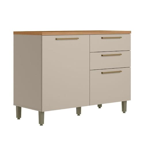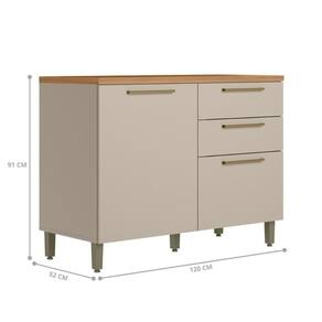 Um balcão de 1,20m feito completamente em MDF, oferecendo gavetas com corrediças telescópicas e porta com dobradiças amortecidas, combinando durabilidade, funcionalidade e um fechamento suave para a cozinha.