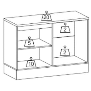 5kg na prateleira superior e 10kg na prateleira inferior e 2kg em cada gaveta