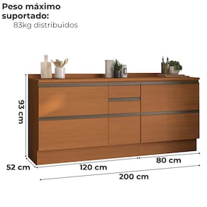 Peso suportado: 20kg no tampo, 7kg cada prateleira e 6kg por gaveta.