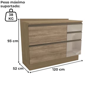 Peso suportado: 20kg no tampo, 7kg cada prateleira e 6kg em cada gaveta.