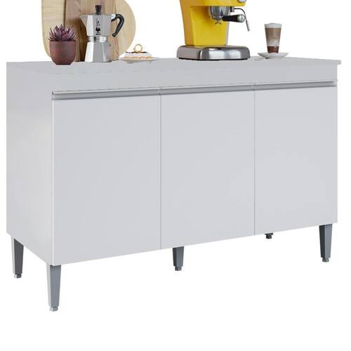 Balcão Com Tampo Manu, funcional e compacto para o dia a dia. Estrutura em MDP (12/15 mm - fundo 3 mm) com pintura UV. Possui portas com dobradiças metálicas, 2 prateleiras internas, puxadores em alumínio e pés plásticos com regulagem. Entregue em 2 volumes.