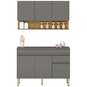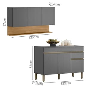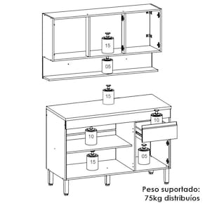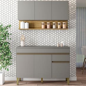 Balcão Com Tampo e Armário Aéreo para quem busca praticidade na organização da cozinha. Produzido em MDP (15mm) com acabamento em pintura UV texturizada. Conta com 06 portas (portas superiores com sistema passante), 01 gaveta, 01 nicho inferior, dobradiças e corrediças metálicas e 01 prateleira interna. Os pés reguláveis são em plástico resistente e os puxadores em perfil alumínio (pintura epóxi). Este produto será entregue em 04 volumes.