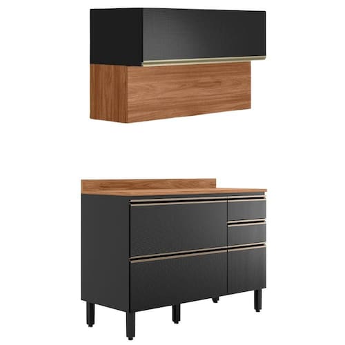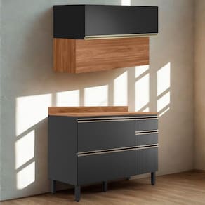 MDFSofisticado e funcional, o Conjunto Balcão e Armário Proença foi pensado para otimizar o espaço com elegância. Produzidos 100% em MDF (20 e 15 mm) com acabamento em pintura UV. Conta com portas basculantes com pistão a gás e dobradiças metálicas de 35 mm, gavetas laterais (uma com divisor de talheres) e gavetão inferior, equipadas com corrediças telescópicas, pés com regulagem de altura, puxadores em alumínio e tampo em MDF 20mm. Este produto será entregue em 04 volumes.