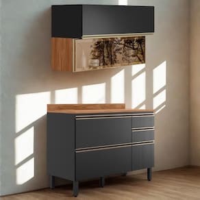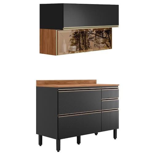 MDFSofisticado e funcional, o Conjunto Balcão e Armário Proença foi pensado para otimizar o espaço com elegância. Produzidos 100% em MDF (20 e 15 mm) com acabamento em pintura UV. Conta com portas basculantes com pistão a gás e dobradiças metálicas de 35 mm (sendo uma com vidro Reflecta de 3 mm), gavetas laterais (uma com divisor de talheres) e gavetão inferior, equipadas com corrediças telescópicas, pés com regulagem de altura, puxadores em alumínio e tampo em MDF 20mm. Este produto será entregue em 04 volumes.