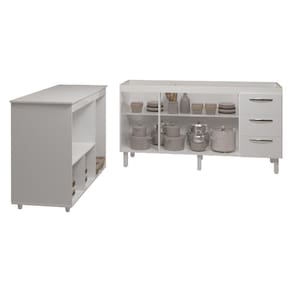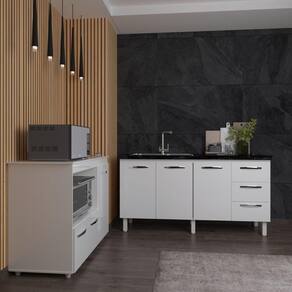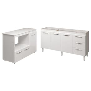 Balcão Cozinha Armário Gabinete De Pia 160 Cm Estela E Balcão Para Microondas E Forno Elétrico Lilian Branco Transforme sua cozinha com o Kit Balcão de Pia Estela 160 cm + Balcão para Microondas e Forno Lilian da Mobília Decor. O Balcão Estela é espaçoso e elegante, com puxadores cromados que trazem sofisticação ao ambiente, perfeito para quem precisa de amplo espaço de armazenamento. Já o Balcão Alana foi projetado para otimizar sua cozinha, com uma porta lateral ideal para utensílios maiores e duas portas inferiores, garantindo que tudo esteja organizado de forma prática e acessível. Perfeito para quem busca estilo e funcionalidade em um só conjunto!