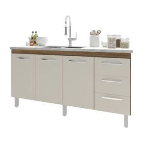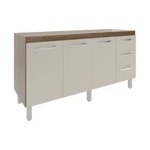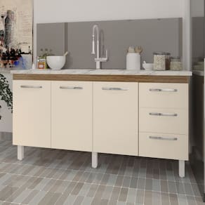 Características: Altura com pés: 83,5 cm Altura sem pés: 67 cm Largura: 157 cm (padrão para pia de 160 cm) Profundidade: 50 cm Material: MDP (madeira) Portas: 3 portas Gavetas: 3 gavetas Prateleiras: 1 prateleira Puxadores: 6 puxadores plásticos cromados Pés: 6 pés reguláveis de plástico Altura dos pés: 16,5 cm Regulagem dos pés: Somente para nivelamento (chega no máximo a 18 cm) Corrediças: Metálicas Indicações de uso: Cozinha