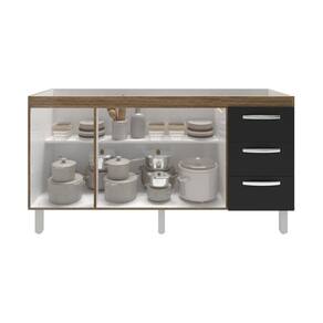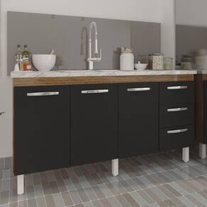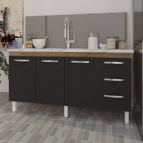 Características: Altura com pés: 83,5 cm Altura sem pés: 67 cm Largura: 157 cm (padrão para pia de 160 cm) Profundidade: 50 cm Material: MDP (madeira) Portas: 3 portas Gavetas: 3 gavetas Prateleiras: 1 prateleira Puxadores: 6 puxadores plásticos cromados Pés: 6 pés reguláveis de plástico Altura dos pés: 16,5 cm Regulagem dos pés: Somente para nivelamento (chega no máximo a 18 cm) Corrediças: Metálicas Indicações de uso: Cozinha