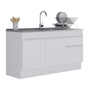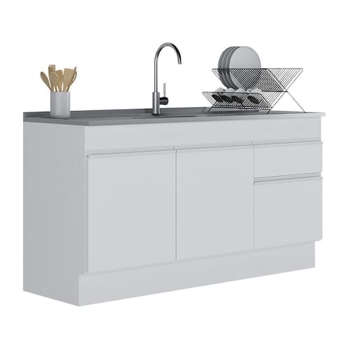 O Balcão Cozinha com Rodapé Gabinete Pia 150 cm 3 Portas 1 Gaveta Veneza Multimóveis tem um excelente custo benefício e um amplo espaço interno. Produzido em MDP com acabamento acetinado (cerca de 20% de brilho), que garante maior durabilidade e resistência, possui corrediças metálicas (mais leveza no manuseio), rodapés, que deixam o ambiente mais estiloso, puxadores em ABS e tampo em MDP 15mm com pintura de alta resistência. O balcão possui tampo removível (compatível com pia de 150 cm) e a gaveta pode ser montada de ambos os lados (direito ou esquerdo). *Não acompanha pia de inox.