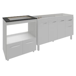 Balcão Cozinha Gabinete De Pia 140 Cm Camila E Balcão Evelyn Para Fogão Cooktop 4 Bocas E Forno Elétrico Branco A sua cozinha merece móveis que a deixem ainda mais bonita, certo? Mas isso não significa que você precisa gastar muito em móveis de uma única marca. A Mobília Decor oferece um Kit Balcão de Pia com Balcão para Cooktop e Forno Elétrico, perfeito para quem deseja praticidade e estilo, por um preço acessível! Fabricados em MDP com pintura UV de alta qualidade, esses móveis são duráveis e vão transformar sua cozinha. Adquira o seu agora! Características do Balcão de Pia Camila 138 cm: Altura: 83,5 cm (com pés) | 67 cm (sem pés) Largura: 138 cm (padrão para pia de 140 cm) Profundidade: 50 cm Material: MDP (madeira) Portas: 4 Gavetas: 1 Prateleiras: 1 Puxadores: 6 plásticos cromados Pés: 6 reguláveis de plástico (altura: 16,5 cm, ajustáveis até 18 cm) Corrediças: Metálicas Acompanha tampo: Não Indicação de uso: Cozinha
