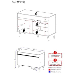Dimensões do produto montado: Altura: 84cm | Largura: 120cm | Profundidade: 53cm (balcão com tampo) *Você pode consultar as medidas internas na imagem técnica do produto.