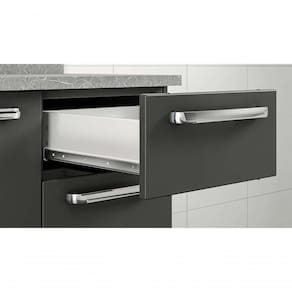 Gavetas com corrediças telescópicas que abrem suavemente e têm trava de segurança para não cair.