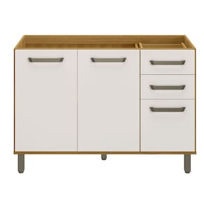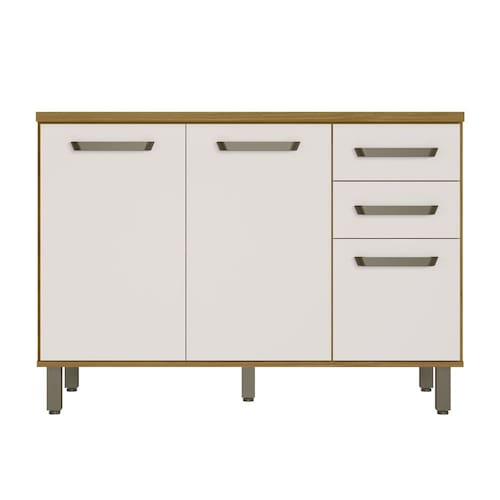 Características: Sem tampo Gavetas: 2 corrediças Peso suportado: 27kg Portas: 3, de giro -bater- Corrediças: 2, telescópicas Pés: 5, reguláveis, PVC 17cm Prateleira: 1 prateleira fixa; 3kg Puxadores: 5, bronze em polímero Dobradiças: 6, metálicas de 35mm Montagem: parafusos, pregos, cavilhas. Acabamento e revestimento: revestimento BP Material: Estrutura MDP Perffect Touch 15mm Balcão flex: para ser utilizado com pia de 120cmx50cm