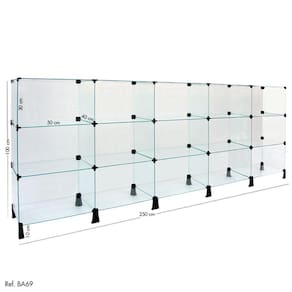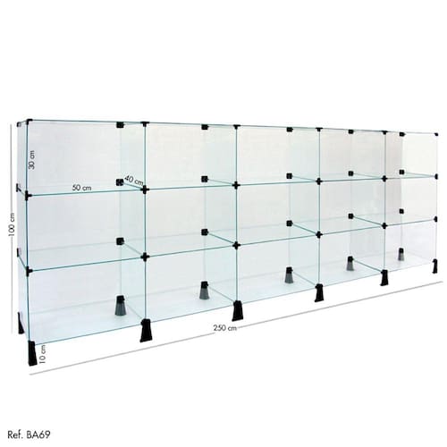 Balcão de Atendimento Modulado em vidro temperado de 4mm com bordas tratadas e 15 casuloss de 0,30 x 0,50. Balcão ideal para lojas de roupas, papelaria e afins.