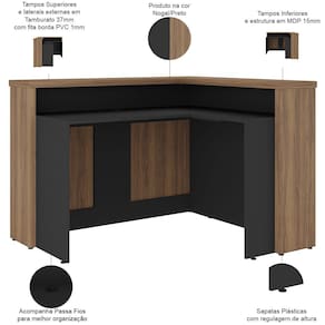 Além disso, a funcionalidade também se faz presente, já que conta com tampos superiores e inferiores amplos, a fim de manter a organização de tudo o que precisar sobre a bancada de trabalho. Já a versatilidade está no fato de poder montar esse balcão em L em ambos os lados, de modo que você consiga adequá-lo ao layout do seu ambiente. Para completar, as sapatas com regulagem de altura garantem estabilidade em qualquer piso, enquanto o passa fios mantém os cabos organizados e fora de vista.