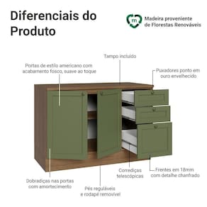 O acabamento de alta resistência da estrutura é em amadeirado Rustic e das portas em Verde. Possui uma textura suave ao toque, trazendo leveza e sofisticação ao ambiente. O destaque fica por conta dos puxadores ponto em ouro envelhecido, feitos com metal resistente, trazem personalidade e um charme único. Outro diferencial está no detalhe chanfrado das frentes, que forma molduras elegantes e dá profundidade ao design, refletindo o estilo americano com um toque moderno.