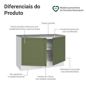 O acabamento de alta resistência da estrutura é em Branco e das portas em Verde. Possui uma textura suave ao toque, trazendo leveza e sofisticação ao ambiente. O destaque fica por conta dos puxadores ponto em ouro envelhecido, feitos com metal resistente, trazem personalidade e um charme único. Outro diferencial está no detalhe chanfrado das frentes, que forma molduras elegantes e dá profundidade ao design, refletindo o estilo americano com um toque moderno.