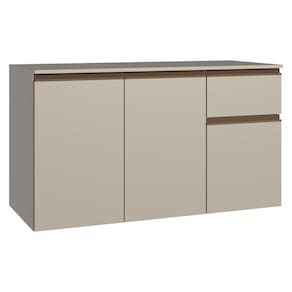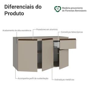 Produzido com materiais de qualidade, o balcão conta com dobradiças metálicas nas portas e puxadores em perfil de alumínio, discretos e resistentes. As gavetas possuem corrediças que permitem abertura total, oferecendo mais praticidade no uso diário. O tampo é removível, possibilitando a instalação de cuba ou pedra conforme o projeto e o acabamento de alta resistência mantém a beleza do móvel por muito mais tempo.