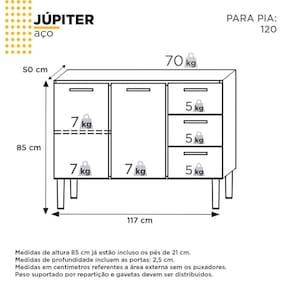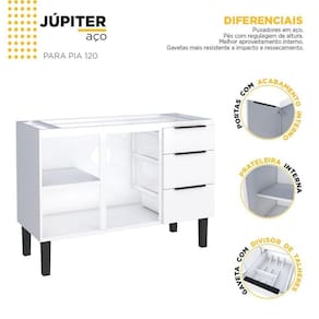 A linha de armários em aço para cozinha Apolo Flat, da Cozimax, é resistente, fabricado em aço eletrogalvanizado com garantia de 5 anos, protegido por pintura em pó eletrostática, possui design moderno com cantos retos, detalhe clássico rebaixado nas portas, puxadores em aço eletrogalvanizado. Acabamento da Prateleira: Pintura Escala de Brilho da Prateleira: Semi-Brilho Acabamento da Gaveta: Pintura Escala de Brilho da Gaveta: Brilhante Material do Puxador da Gaveta: Metal Acabamento da Porta: Pintura Escala de Brilho da Porta: Brilhante Material do Puxador da Porta: Poliestireno Altura dos Pés: 21 cm Ambiente Principal: Cozinha codigo_ean: 7909903366356 Complexidade da Montagem: Média: pode ser montado por mais de uma pessoa e/ou necessite de maior conhecimento para montagem Cor: Branco Cor do Produto: Branco Escala de Brilho: Brilhante Gaveta com Chave: Não Itens Inclusos: 1 Balcão, Kit Ferragens, 1 Manual de Montagem Linha ou Coleção: Júpiter Manual de Montagem e Instalação: https://product-hub-prd.madeiramadeira.com.br/809417/documents/49552d75-3829-4648-b724-5927bb5fcfeemanualjupiter120desmontado.pdf Material da Dobradiça/Corrediça da Porta: Metálica Material da Gaveta: Polipropileno Material da Porta: Aço Material da Prateleira: Aço Material dos Pés: Polipropileno Necessita Montagem: Sim Origem do Produto: Nacional Pés Reguláveis: Sim Peso: 18 kg Peso Máximo por Gaveta: 5 kg Peso Máximo por Prateleira: 7 kg Possui Espelho: Não Possui Possui Pés: 04 Possui Portas: Sim Possui Prateleiras: Sim Possui Rodízio: Não Produto Montado: Sim Recomendações de Uso, Manutenção e Limpeza: Pano Umedecido Sapatas Niveladoras: Não Sistema de Montagem: Parafusos Suporta Até (kg): 70 kg Tipo de Corrediça da Gaveta: Simples Tipo de Dobradiça/Corrediça da Porta: Simples Tipo de Puxador da Gaveta: Externo Tipo de Puxador da Porta: Externo