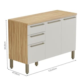 Composto por 3 portas e 2 gavetas, o balcão oferece um espaço interno versátil e bem distribuído, permitindo armazenar desde pequenos itens, como talheres e panos de prato, até panelas e recipientes maiores. As gavetas deslizam suavemente, garantindo facilidade de uso no dia a dia, enquanto as portas com dobradiças reforçadas proporcionam uma abertura segura e duradoura.