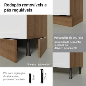 O acabamento de alta resistência da estrutura é em amadeirado Rustic e das portas em Branco. Possui uma textura suave ao toque, trazendo leveza e sofisticação ao ambiente. O destaque fica por conta dos puxadores ponto em ouro envelhecido, feitos com metal resistente, trazem personalidade e um charme único.