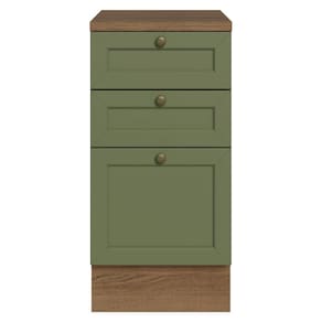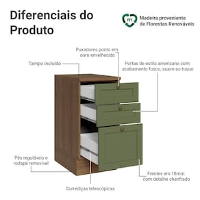 O acabamento de alta resistência da estrutura é em amadeirado Rustic e das gavetas em Verde. Possui uma textura suave ao toque, trazendo leveza e sofisticação ao ambiente. O destaque fica por conta dos puxadores ponto em ouro envelhecido, feitos com metal resistente, trazem personalidade e um charme único. Outro diferencial está no detalhe chanfrado das frentes, que forma molduras elegantes e dá profundidade ao design, refletindo o estilo americano com um toque moderno.