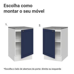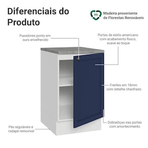 O acabamento de alta resistência da estrutura é em Branco e da porta em Azul. Possui uma textura suave ao toque, trazendo leveza e sofisticação ao ambiente. O destaque fica por conta do puxador ponto em ouro envelhecido, feito com metal resistente, traz personalidade e um charme único. Outro diferencial está no detalhe chanfrado das frentes, que forma molduras elegantes e dá profundidade ao design, refletindo o estilo americano com um toque moderno.