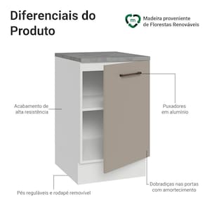 Combinando praticidade e qualidade, o móvel possui dobradiças metálicas com amortecimento, garantindo um fechamento suave e silencioso, possui pés reguláveis e o rodapé removível facilita a limpeza.