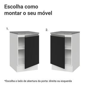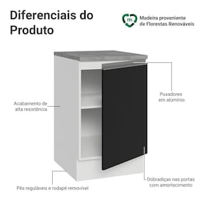 A porta possui dobradiças com amortecimento, garantindo um fechamento suave e silencioso. Possui pés reguláveis e o rodapé removível facilita a limpeza. O espaço interno é ótimo para organizar utensílios, panelas ou produtos de uso frequente.