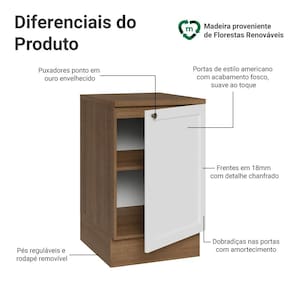 O acabamento de alta resistência da estrutura é no tom amadeirado Rustic e da porta em Branco. Possui uma textura suave ao toque, trazendo leveza e sofisticação ao ambiente. O destaque fica por conta do puxador ponto em ouro envelhecido, feito com metal resistente, traz um charme único. Outro diferencial está no detalhe chanfrado das frentes, que forma molduras elegantes e dá profundidade ao design, refletindo o estilo americano com um toque moderno.