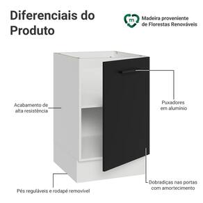 O móvel possui dobradiças metálicas com amortecimento, garantindo um fechamento suave e silencioso, possui pés reguláveis e o rodapé removível facilita a limpeza.