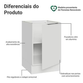 As portas contam com dobradiças com amortecimento, oferecendo um fechamento suave e silencioso. O balcão possui pés com regulagem de altura e rodapé removível, tornando a limpeza mais fácil.