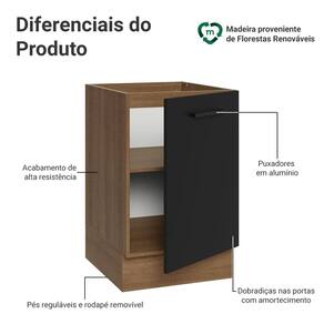 O móvel possui dobradiças metálicas com amortecimento, garantindo um fechamento suave e silencioso, possui pés reguláveis e o rodapé removível facilita a limpeza.
