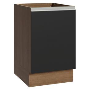 O acabamento da estrutura é no tom amadeirado Rustic e a porta em preto, transmitindo um design marcante e sofisticado. O puxador em perfil de alumínio, no estilo cava, é um dos destaques: moderno, minimalista e muito prático no dia a dia.