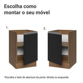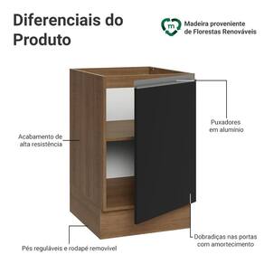 A porta possui dobradiças com amortecimento, garantindo um fechamento suave e silencioso. Possui pés reguláveis e o rodapé removível facilita a limpeza. O espaço interno é ótimo para organizar utensílios, panelas ou produtos de uso frequente.