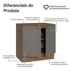 O acabamento de alta resistência da estrutura é em amadeirado Rustic e das portas em Cinza. Possui uma textura suave ao toque, trazendo leveza e sofisticação ao ambiente. O destaque fica por conta dos puxadores ponto em ouro envelhecido, feitos com metal resistente, trazem personalidade e um charme único. Outro diferencial está no detalhe chanfrado das frentes, que forma molduras elegantes e dá profundidade ao design, refletindo o estilo americano com um toque moderno.