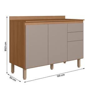 Modelo: Balcão 120 cm Acacia com Tampo; Material da estrutura: MDP de 15 mm; Dimensões: 120 cm (L) x 82 cm(A) x 51,5 cm(P); Quantidade de porta: 02 (dobradiças metálicas e fecho toque); Quantidade de gaveta: 03 sendo (corrediças metálicas); Medidas internas da gaveta: 32 cm(L) x 38,5 cm(P) x 10 cm(A); Com puxador: não se aplica; Quantidade prateleiras: 01; Pés com regulagem: Sim; Peso suportado: até 26 kg distribuídos. Requer montagem: Sim (kit montagem incluso); Embalagem do envio: Papelão e plástico;