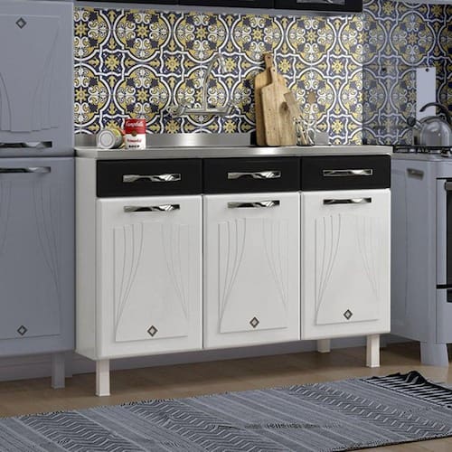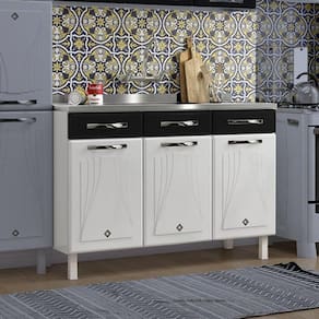 O Balcão Triplo de aço para pia Star New é aquele móvel funcional que todo mundo em sonha ter em casa. É perfeito para a acomodação de louças, panelas e eletros, além de ser uma peça coringa no visual da cozinha: com a qualidade reconhecida da marca Telasul e a beleza da estampa Star New – uma linha que é sucesso garantido. Gravado em alto relevo, o desenho proporciona um lindo efeito combinado com aplicações alto brilho em resina e com puxadores na cor ônix. O balcão conta com duas gavetas – 1 frente falsa para pia - fabricadas em polipropileno, um plástico rígido e lavável, que suporta até 5Kg de peso. Produzido todo em aço, passa por um rígido processo de pintura eletrostática e anticorrosiva, que garante proteção e resistência. A linha Star New é perfeita para cozinhas com personalidade.
