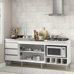 O Balcao Completo e o movel util e versatil para complementar a sua cozinha. Dispoe de um design atual que facilita na hora de montar a decoracao, proporcionando um espaco mais organizado e sofisticado. O balcao possui espaco para pia, duas portas com prateleira interna, tres gavetas espacosas, nicho para forno/micro, nicho adega para quatro garrafas e tampo com ranhura que pode ser utilizado para fogao cooktop de 4 bocas. Produzido com materiais de excelente qualidade, garantindo a durabilidade e vida util do movel. O melhor em moveis no design atual aliando conforto, qualidade e otimos precos!