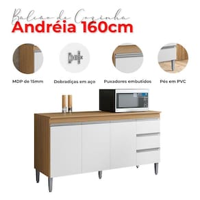 Balcão de Cozinha Andréia com Tampo 160cm Amêndoa Branco - AJL