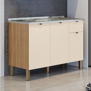 Produzido em MDF de 12mm com acabamento em pintura UV, o Balcão Para Pia garante durabilidade e resistência para o uso. As dobradiças metálicas e as corrediças telescópicas promovem uma abertura e fechamento suave, enquanto os puxadores em alumínio tornam o manuseio mais prático e confortável. Além disso, os pés em plástico resistente são reguláveis, o que permite ajustar pequenos desníveis de piso e manter a estabilidade do produto.