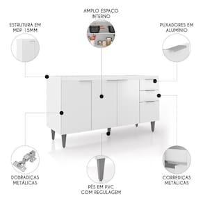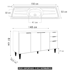 Dispõe de quatro portas com dobradiças metálicas, que proporcionam uma abertura suave, além de duas gavetas com corrediças metálicas. O Balcão Gabinete também se destaca pelos puxadores em alumínio, que adicionam um toque de sofisticação e elegância ao ambiente. Sua estrutura em MDP 15mm, com acabamento em BP, garante maior resistência e durabilidade. O Balcão de Cozinha possui uma prateleira interna, que é uma ótima solução para organizar seus itens de maneira eficiente, acomodando mantimentos, panelas e outros utensílios. A Pia Inox conta com um design ideal, que tem excelente desempenho no escoamento da água e possibilita o uso de diferentes objetos sobre ela. Os pés em PVC, são reguláveis, permitindo ajustar pequenos desníveis de piso e manter a estabilidade do produto.