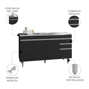 Balcão De Cozinha Com Pia Inox 160cm 3 Gavetas Andréia Preto - Ajl Móveis