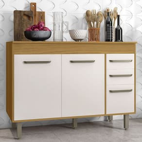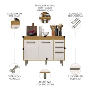O Balcão de Cozinha possui três portas com dobradiças metálicas reforçadas, que proporcionam um movimento suave. As duas gavetas com corrediças telescópicas, permitem abertura total, facilitando o acesso aos itens. Os puxadores em polímero completam o visual com um toque charmoso. O Tampo serve como apoio para eletrodomésticos e complementa o móvel com elegância.