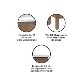 Características: Estrutura: 100 MDP Acabamento: FF -Finish Foil- Quantidade de Portas: 2 Tipo de Dobradiças: Metálica 26mm Quantidade de Prateleiras: 1 Tipo de Puxador: Perfil Alumínio Gola Tipo de Pés: Plástico PS Champagne com regulagem de altura Sistema de Montagem: Cavilhas, Parafusos e Minifix Itens Inclusos: 1 Balcão, kit ferragens e manual de montagem Garantia: 3 meses
