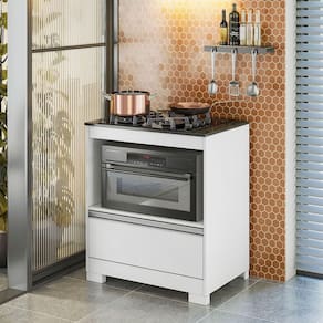 Esse balcão é projetado para acomodar um cooktop, proporcionando um espaço seguro e adequado para a sua utilização. Além disso, ele também possui um espaço destinado a forno ou micro-ondas, permitindo que você tenha todos os seus eletrodomésticos essenciais em um só lugar, otimizando o espaço da sua cozinha.