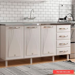 Informações Técnicas: Prateleira: 01 Gavetas: 04 Portas: 03 Cor: Branco brilhante Material: 100% aço Portas com design harmônico Puxadores e apliques na cor Ônix Corrediças metálicas Pintura eletrostática com preparo antiferrugem Pés com regulagem de altura Pia não inclusa