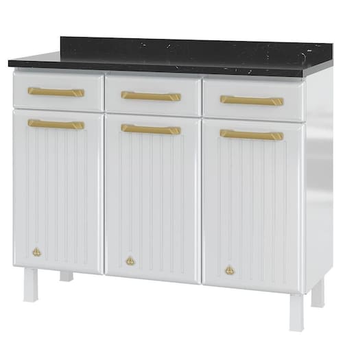 O Balcão Triplo com tampo da linha Diamante é perfeito para quem busca uma solução resistente, bonita e funcional para a rotina na cozinha. Sinônimo de durabilidade, é fabricado 100% em aço, passando por um processo de pintura eletrostática e anticorrosiva, com acabamento brilhoso um tipo de tratamento que reforça a durabilidade do seu móvel. Seu interior é espaçoso e permite a organização dos mais variados itens. Possui 3 gavetas que podem acomodar talheres, tolhas de mesa, panos de prato e outros utensílios que estarão sempre à mão. A estrutura interna das gavetas é de polipropileno, um plástico muito rígido, resistente e fácil de lavar. O tampo do Balcão é robusto, desenvolvido em MDP. A beleza do design também é destaque aqui: as delicadas linhas icais das portas inspiradas na tendência atual da decoração - em combinação com o aplique em alto relevo do diamante e o belo puxador em tom dourado, fazem o ambiente brilhar! A linha Diamante é totalmente modular; combine este lindo Balcão com outros itens da mesma linha para criar a sua cozinha ideal. Resistente, prática e linda!